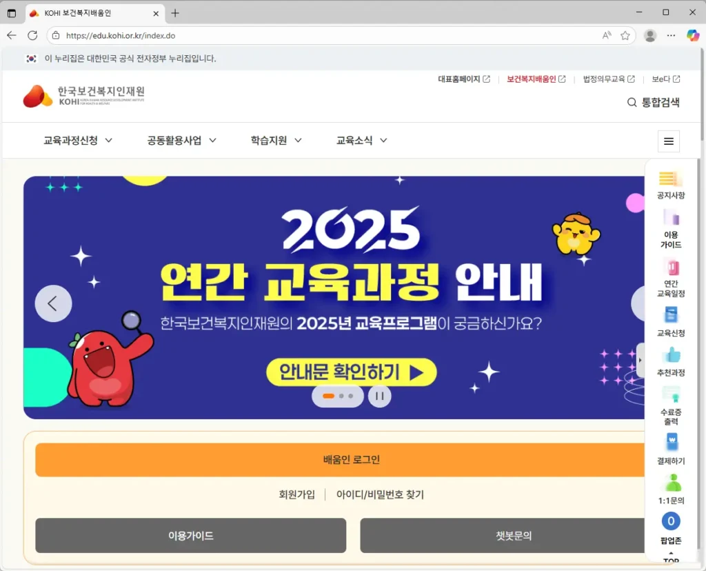 코히 의무교육 바로가기 (edu.kohi.or.kr)는 한국보건복지인력개발원(KOHI)에서 제공하는 다양한 의무교육 및 전문 교육 과정으로의 직접적인 접근 경로를 나타냅니다. 보건복지 분야 종사자 및 관련 교육 대상자들이 필수적으로 이수해야 하는 법정 의무교육 및 직무 역량 강화 교육을 신속하고 편리하게 찾고 수강할 수 있도록 돕는 온라인 플랫폼의 핵심 역할을 함축하고 있습니다.
